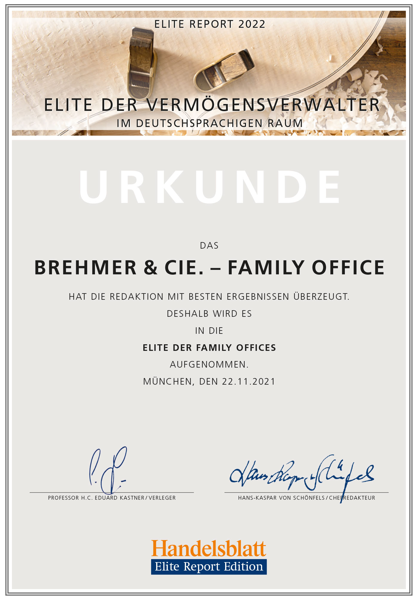 Auch in diesem Jahr, und damit zum siebten Mal in Folge, wurde die BREHMER & CIE. als eines der besten Family Offices Deutschlands gekürt. Die jährlich vom Handelsblatt, dem Elite Report und der Bayerischen Staatsregierung verliehene Auszeichnung bestätigt die hohe Kundenzufriedenheit und solide Performance der vergangenen Monate.