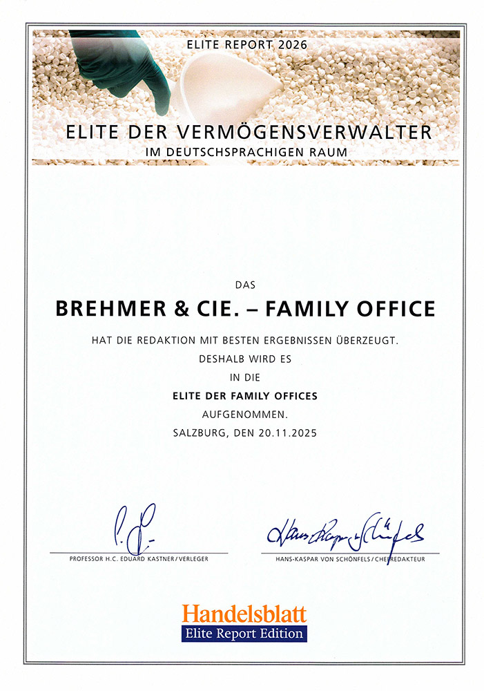 Das BREHMER & CIE. Family Office wurde zum elften Mal in Folge als eines der führenden Family Offices im deutschsprachigen Raum ausgezeichnet und erneut in die ELITE der Family Offices aufgenommen. Die Auszeichnung wird jährlich vom Handelsblatt und dem ELITE Report vergeben.